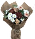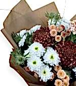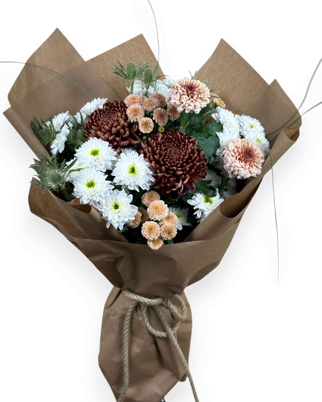 Amber Harvest, sonbaharın sakin tonlarını taşır. Dolgun bordo–karamel kasımpatılar, beyaz mini kasımpatı kümeleri ve mavi eryngium; doğal yeşillerle dengelenip kraft sargıyla tamamlanır. Teşekkür, tebrik ya da içten bir not için samimi ve fotojenik bir seçimdir.