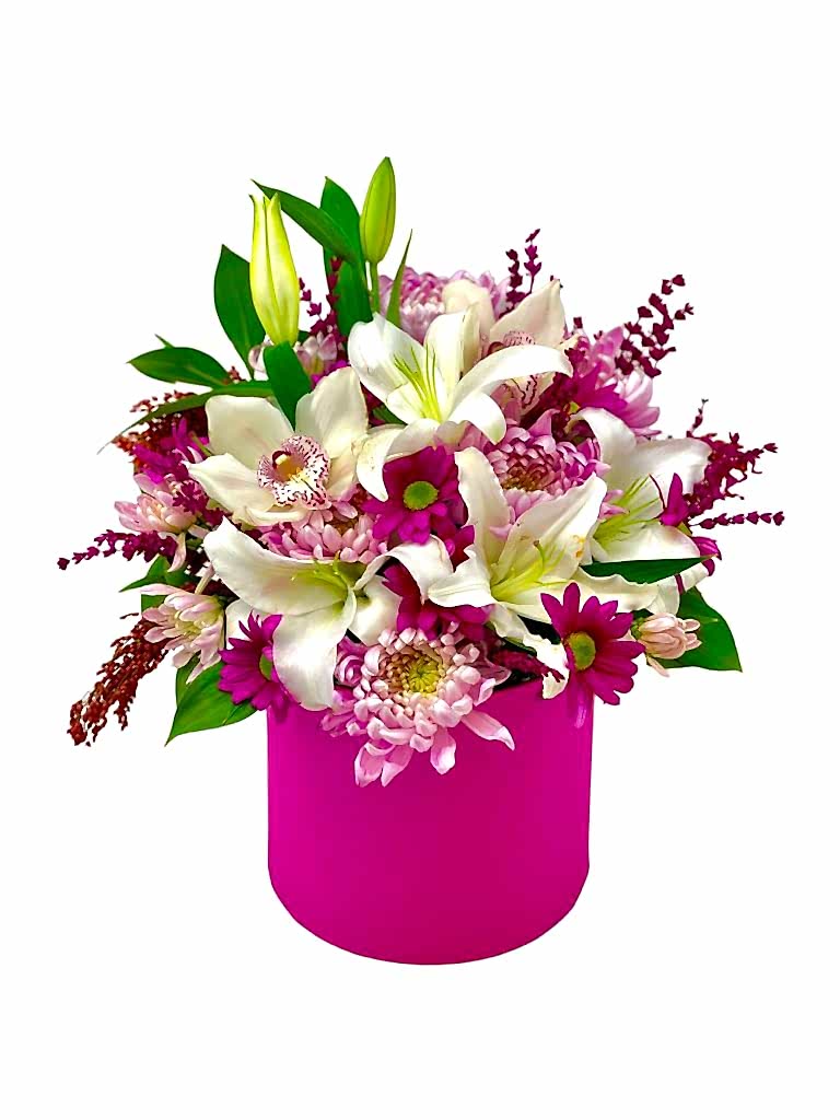 Pembe ve tonlarının ağırlıkta olduğu kutu aranjmanımız özel günlerinize renk katacak.