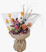 “Protea & Pincushion Alevi” doğrudan doğanın vahşi estetiğinden ilham alır. Pembe tonlu protea, turuncu pincushion, mor-mavi eryngium ve mevsimsel dokular bir araya gelerek sıcak, enerjik ve modern bir kompozisyon oluşturur. Zanaat kraft ambalajıyle doğal bir görünüm sunar; kutlama, tebrik, kurumsal hediye veya “fark yaratmak” istediğiniz her an için idealdir.