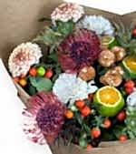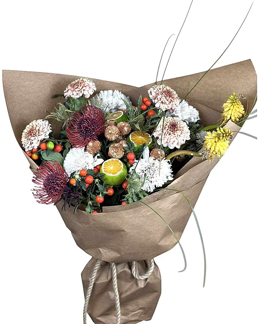 Spiced Citrus Harvest, sıcak baharat tonlarını taze narenciye dokunuşuyla buluşturur. Pincushion’ın heykelsi formu, kasımpatıların dolgun dokusu ve mavi eryngium’un kontrastı; hiperykum meyveleri, yeşiller ve yarım limon/mandalina dilimleriyle zenginleşir. Kutlama, tebrik ve “farklı olsun” diyenler için ideal, rustik–modern bir tasarım.